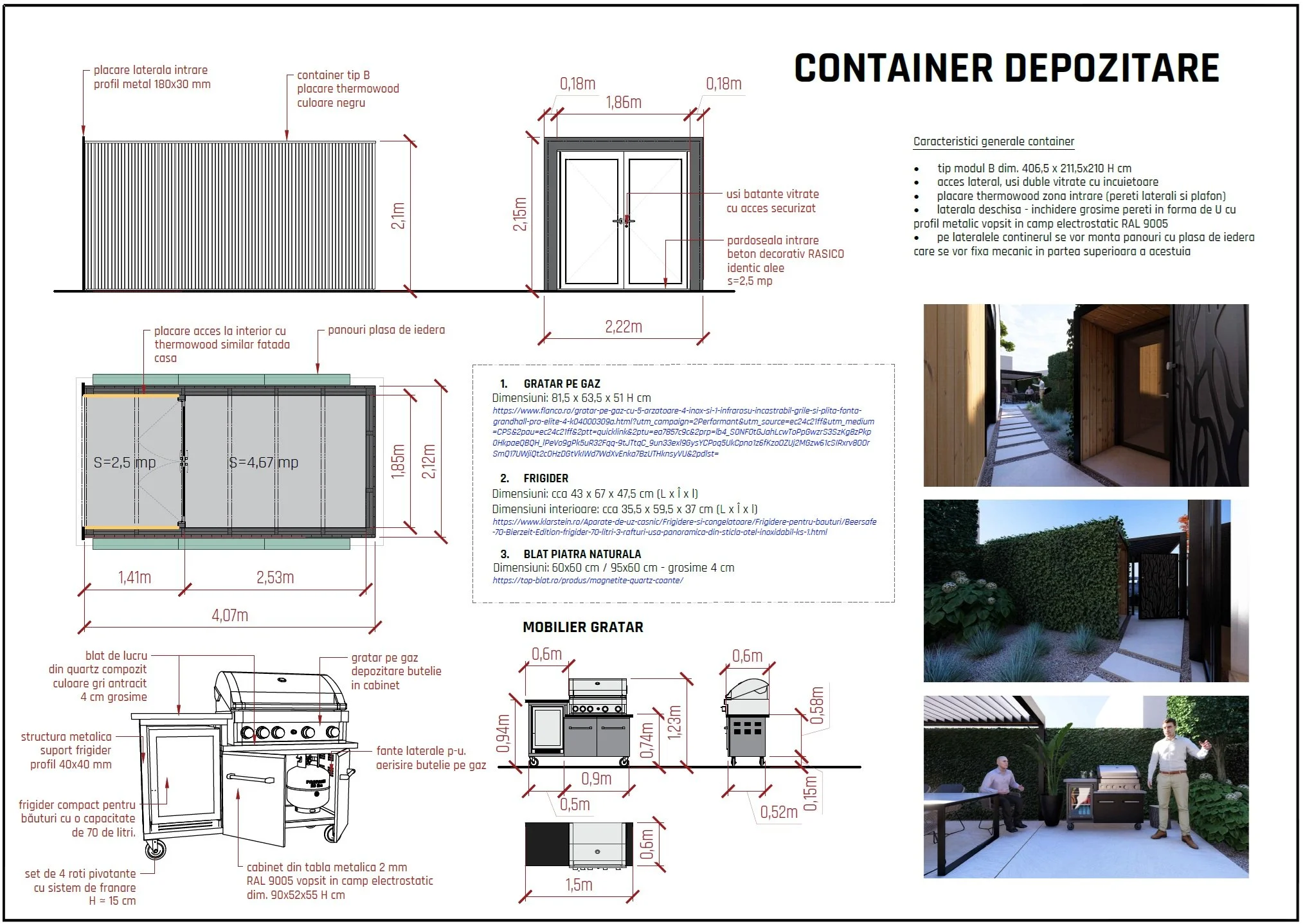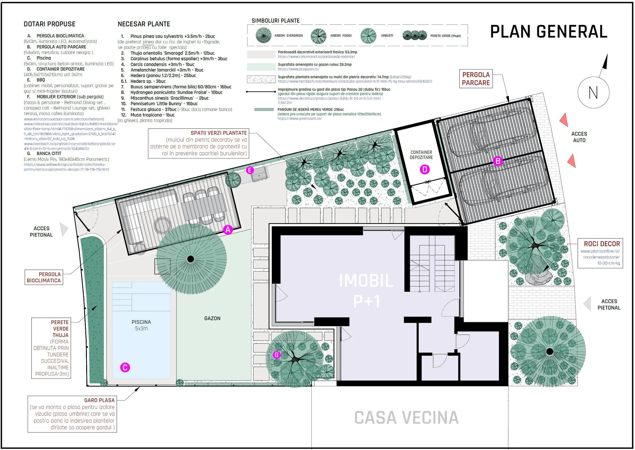 〰️ Dotari: BBQ, piscina, pergola bioclimatica cu masa si canapea exterior, pergola parcare, alei microciment, izolare vizuala perimetrala cu gard viu si plante cataratoare, container depozitare, banca citit